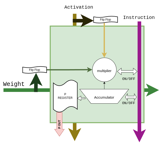 Figure 4 Figure GEMM-Array. The systolic array is a Weight Stationary structure: weights enter from the left, activations from the top, and partial sums collect in the Result Accumulator at the bottom. The zoomed-in green box shows the internals of a single PE.¶