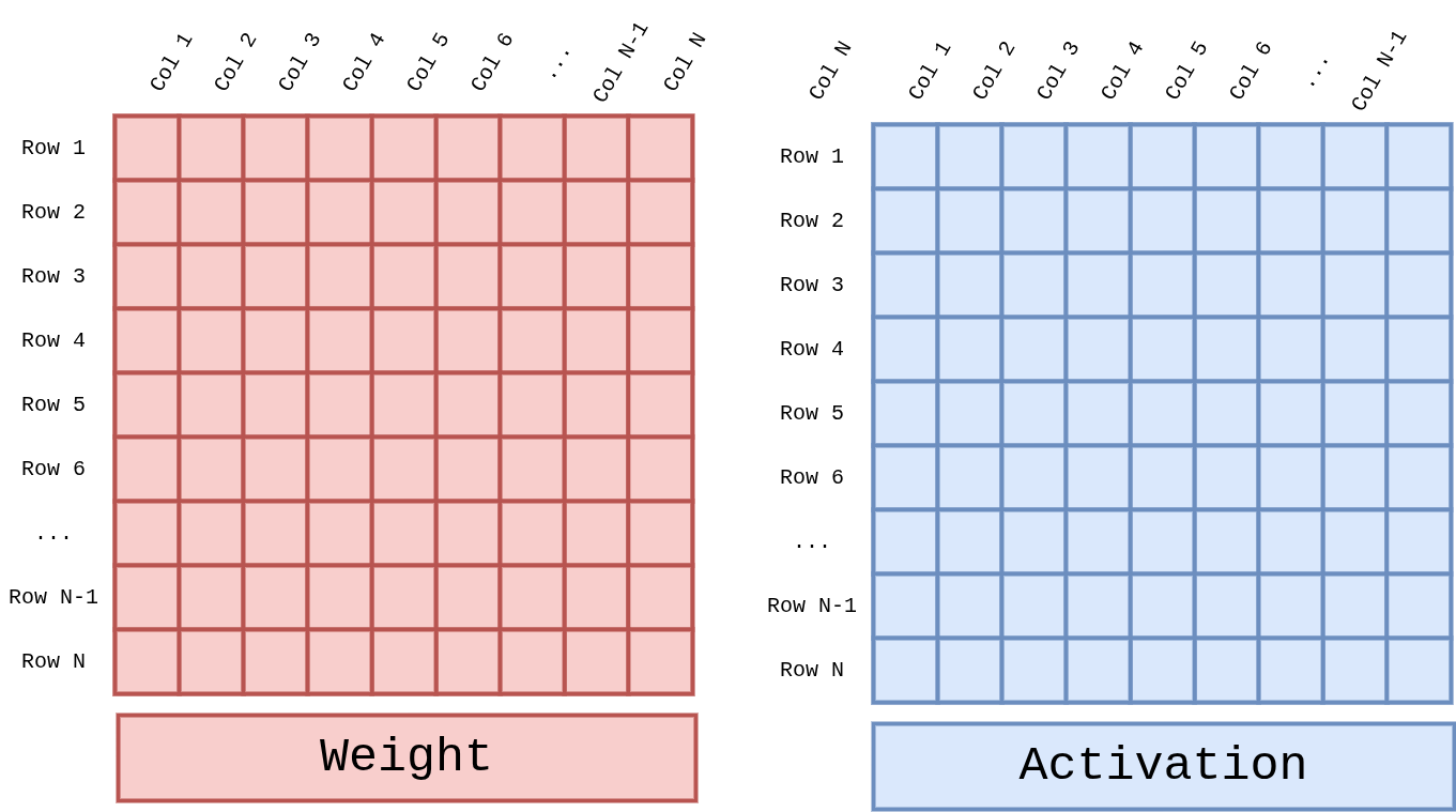 GEMM 은 다음과 같이 Weight (N × N) 와 Activation (N × N) 두 행렬의 곱을 계산합니다.